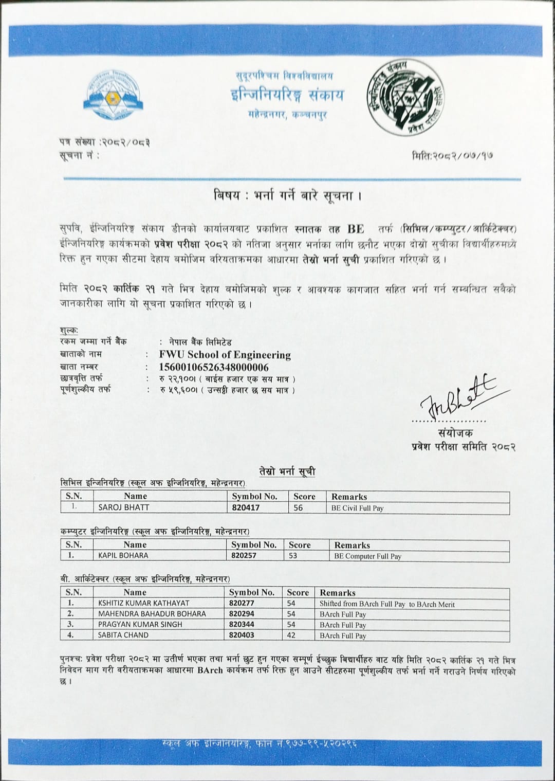 NOTICE: FIRST ADMISSION LIST OF STUDENTS (BE ADMISSION 2080)