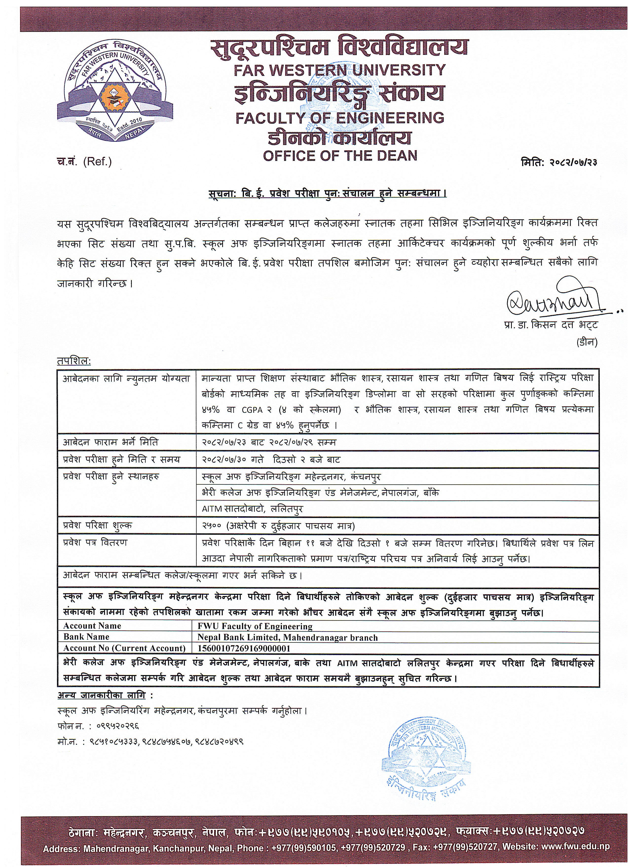 बि.इ.प्रवेश परीक्षाको आबेदन फाराम भर्ने म्याद थप गरिएको सम्बन्धमा